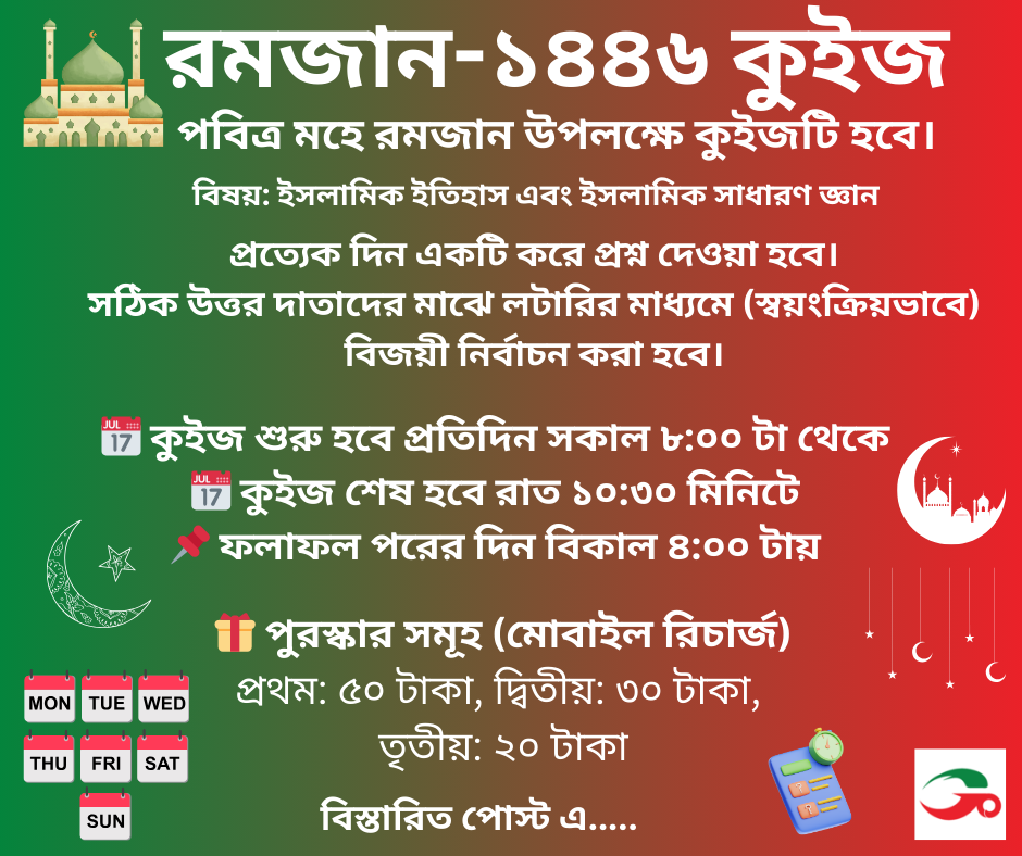 পবিত্র মাহে রমজান উপলক্ষে শুরু হচ্ছে "রমজান-১৪৪৬ কুইজ"! ✨