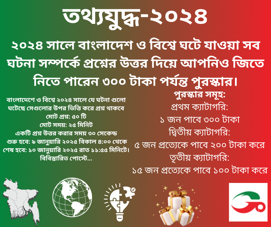 ২০২৪ সালে বাংলাদেশ ও বিশ্বে ঘটে যাওয়া সব ঘটনা সমূহের উপর ভিত্তি করে কিছু প্রশ্নের উত্তর দিয়ে আপনিও জিতে নিতে পারেন পুরস্কার।